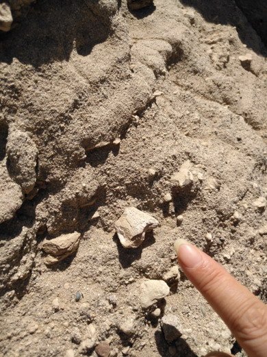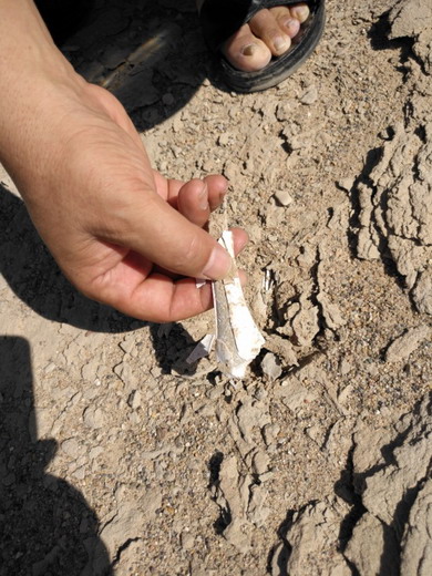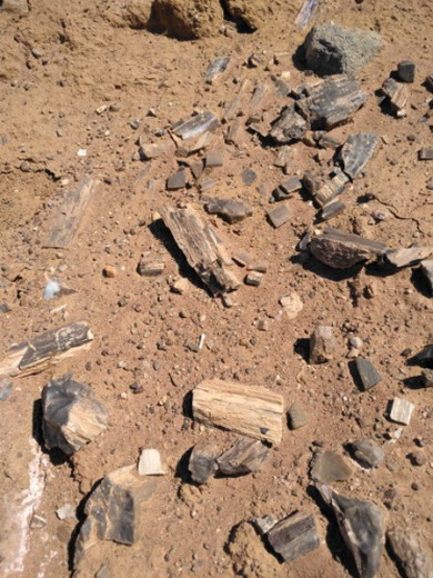 野外风化破碎的恐龙化石散落在泥土里