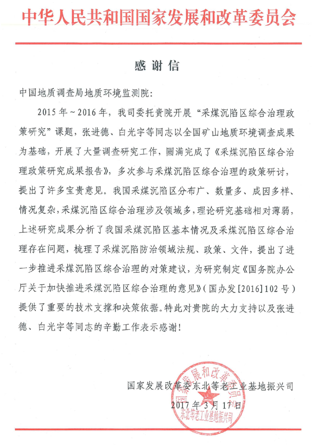 该报告为制定《国务院办公厅关于加快推进采煤沉陷区综合治理的意见》(国办发〔2016〕102号)提供了重要的技术支撑和决策依据,得到了国家发展改革委东北等老工业基地振兴司的充分肯定与高度赞扬,并给环境监测院发来了感谢信以兹鼓励。