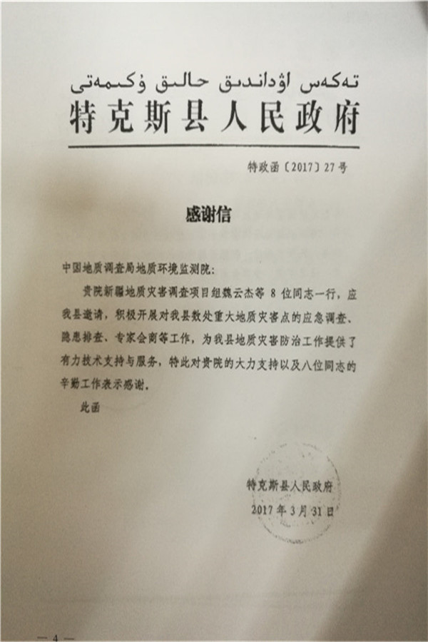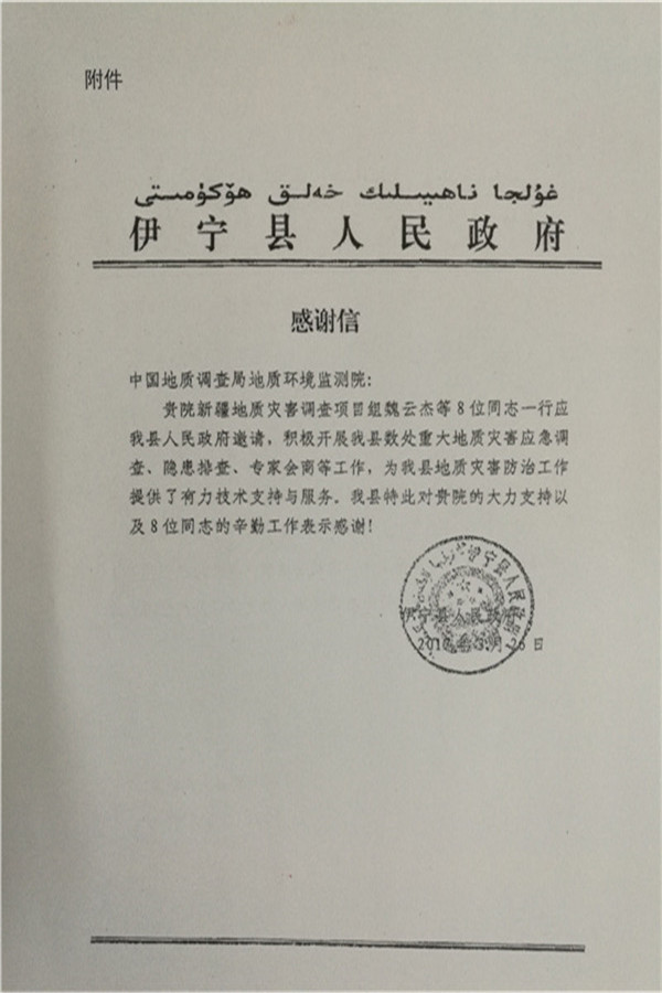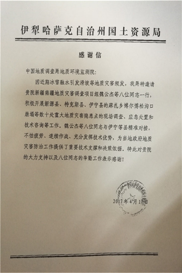 2017年3月,中国地质调查局地质环境监测院新疆南疆地质灾害调查项目组以支撑服务地方需求为己任,完善部署,精心实施,在开展项目研究工作的同时,积极与伊犁州国土局,伊宁县、特克斯县和新源县人民政府及国土资源部门进行了“三对接”,充分发挥技术优势,为地方政府提供了亟需的地质灾害调查及防治技术咨询,较好地服务了地方地质灾害防治需求,所做工作获得了当地政府肯定。
