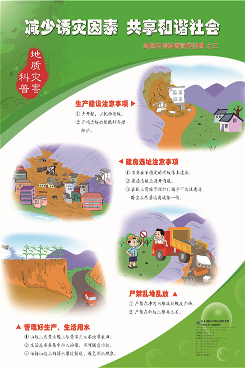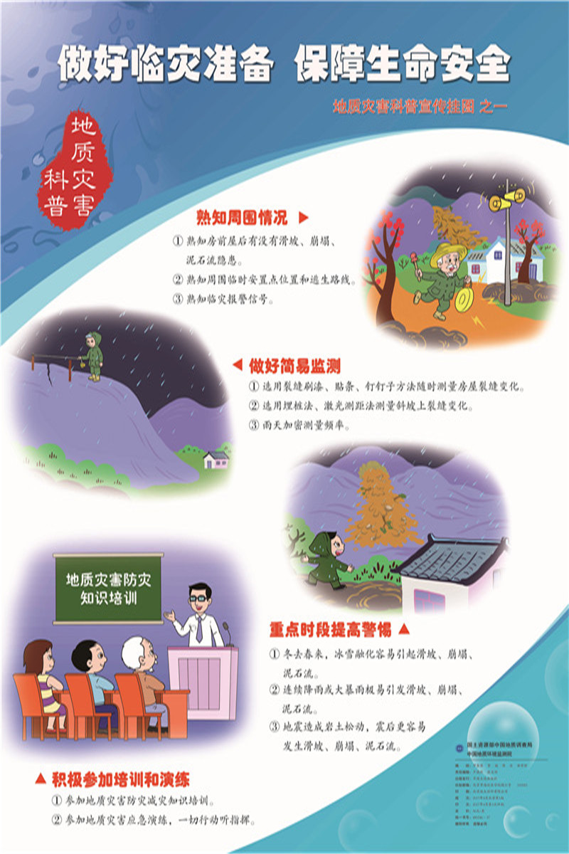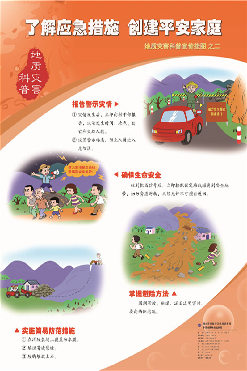 为迎接第9个“5.12”防灾减灾日,响应“科技创新、科学普及是实现创新发展的两翼”号召,环境监测院以提高全民科学素质为己任,以普及实用技能为原则,编制了“做好临灾准备,保障生命安全”、“了解应急措施,创建平安家庭”、“减少诱灾因素,共享和谐社会”为主题的3张地质灾害科普挂图。挂图以图文并茂的形式讲述了崩塌滑坡泥石流避险要领、应急处置以及在崩塌滑坡泥石流易发的山区生活注意事项,从灾前预防、灾中逃生、灾后应急三个方面介绍了地质灾害科普知识与地质灾害防灾避险实用技能。该套挂图是第9个“5.12”防灾减灾日宣传活动科普主产品之一,将在本年度地质灾害科普活动中发挥重要作用。
