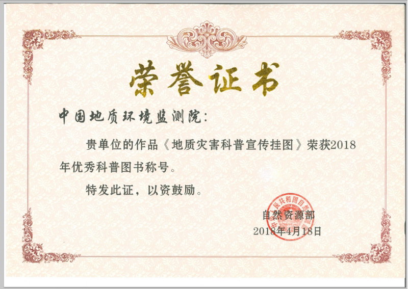 在第49个世界地球日来临之际,自然资源部组织开展了土地资源、地质矿产、地质环境等领域2018年优秀科普图书推介及评选活动,共评选出优秀科普图书38部,向全社会推荐阅读。环境监测院编制的《地质灾害科普宣传挂图》成功入选优秀科普图书。