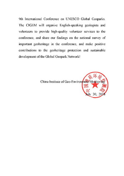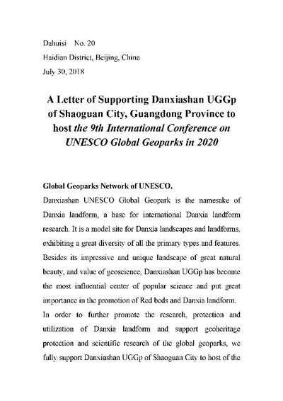 应丹霞山世界地质公园邀请,自然资源部中国地质调查局地质环境监测院(以下简称“环境监测院”)将从三个方面为其提供支持:一是向联合国教科文组织(UNESCO)提交《中国地质环境监测院对于支持韶关市申报世界地质公园大会的函》;二是组织英语水平较高的专家和志愿者为大会提供服务;三是将选派技术骨干参会,展示我国重要地质遗迹调查和研究成果。