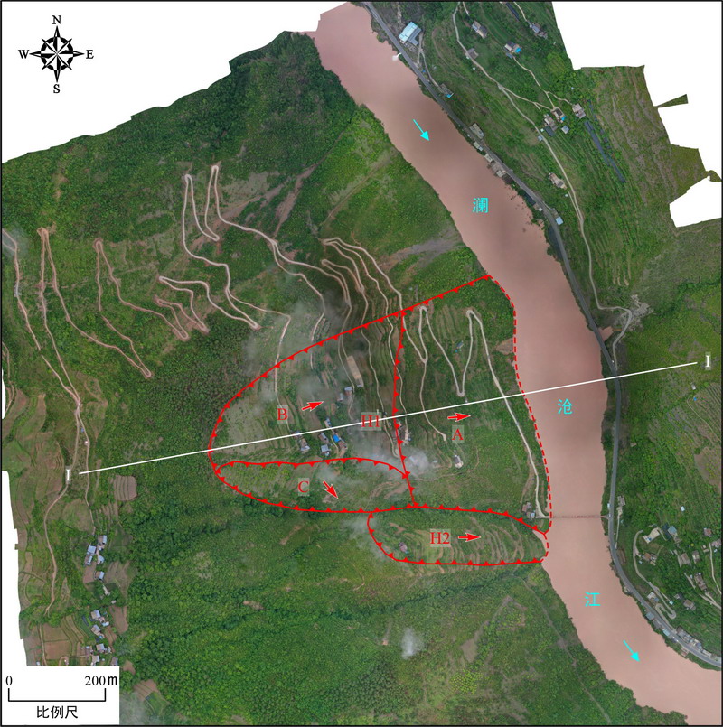 项目组在分析近期气象水文资料和应急监测数据的基础上,采用无人机倾斜摄影和现场调查勘测等手段,详细调查了滑坡规模、变形特征、破坏方式和威胁范围。结合滑坡体裂缝变形情况,项目组初步认为该古滑坡在库水升降和降雨耦合作用下复活,滑坡内部变形不均,后缘和滑体上多处拉张和挤压裂缝累计形变不断增大,且呈逐步加快趋势。