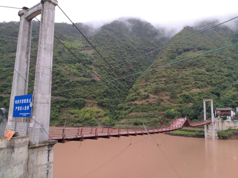 拉金神谷滑坡位于云南省德钦县燕门乡谷扎村,为横断山脉中段、澜沧江上游右岸的一处古滑坡。自6月7日开始,该滑坡滑坡体后缘发生开裂,后缘裂缝向两侧自上向下不断发展。截至7月9日,滑坡后缘及两侧边界形变愈加强烈,裂缝横向宽15~80cm,上下错动5~380cm,沿后缘及两侧延伸长约1200米,滑坡后缘及北侧裂缝现已全部贯通,南侧裂缝也已延伸至中下部。滑坡前缘的蓝青西古悬索吊桥受滑坡体前缘挤压发生变形,桥面中部向上隆起约2米。该滑坡目前处于变形发展阶段,稳定性较差,若持续发展,有失稳入江可能。