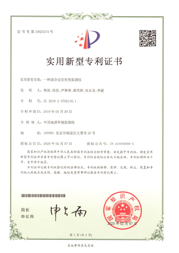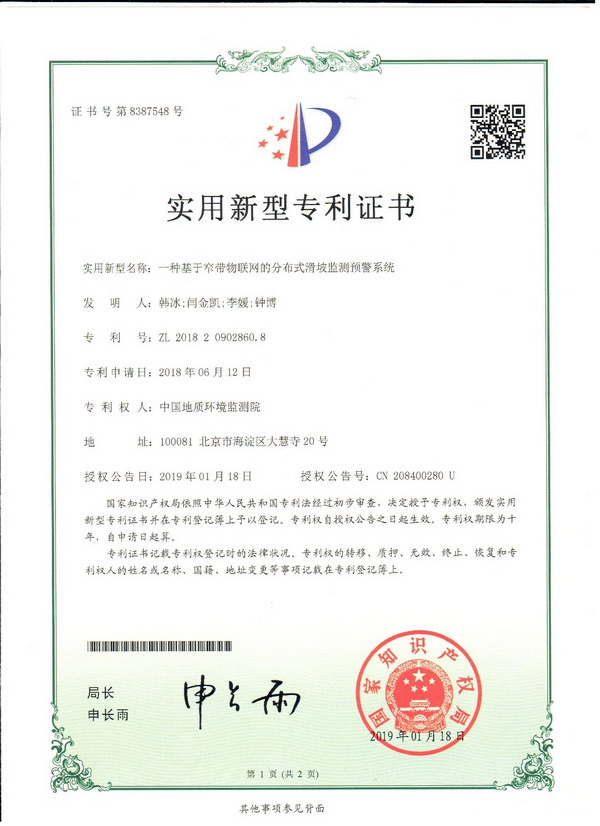 继2019年获得 “一种基于窄带物联网的分布式滑坡监测预警系统”专利后,近日,中国地质调查局地质环境监测院又获2项实用新型专利,即“一种混合定位形变监测仪”和“一种多链路通讯地质灾害GNSS监测系统”。另有2项发明专利进入实质审查阶段。