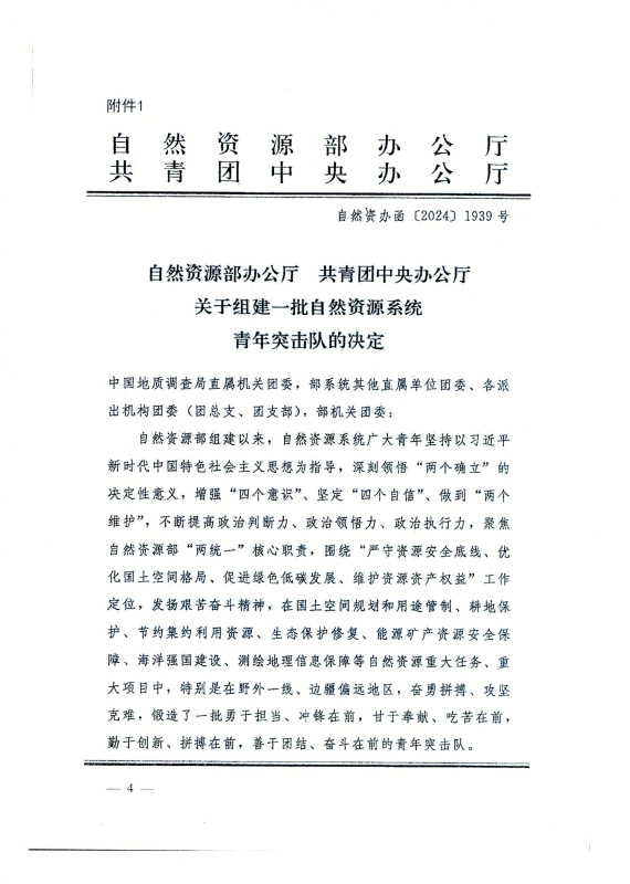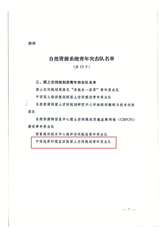 中国地质环境监测院国土空间规划青年突击队是以我院国土空间规划业务版块部门为主体成立的青年突击队,由乐琪浪同志担任队长,总人数22人,40周岁及以下青年比例占77%。近年来,该突击队充分发挥地学优势,积极践行地质工作提质增效要求,主动对标党中央、国务院重大战略要求,精准对接地方发展需求,先后支撑编制完成我国首部《全国国土空间规划纲要(2021-2035年)》,牵头技术支撑编制长江经济带(长江流域)、黄河流域国土空间规划,首次完成全国及长江经济带、黄河流域、京津冀、长三角一体化发展区、粤港澳大湾区、东北振兴区和成渝地区双城经济圈等国家重大区域发展战略区“双评价”,研究提出国家地下水战略储备区建设、水资源保障与水域空间恢复、自然灾害防治、气候变化应对等重大规划对策建议,团队多项创新研究成果,为奠定中国地质调查局在新时代国土空间规划领域的重要地位发挥了积极的显著作用。