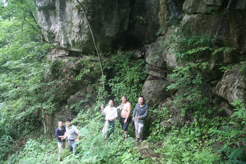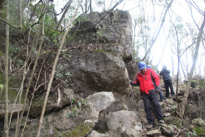 照片3南仁东研究员(右一)与地质专家一起在大窝凼洼地查勘大型松动岩体