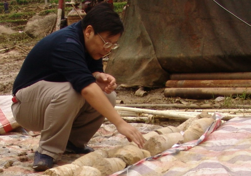 照片2 殷跃平在大窝凼洼地现场察看钻孔岩心