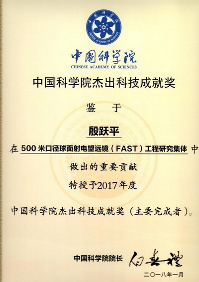 近日,中国科学院为环境监测院(应急技术指导中心)殷跃平研究员颁发了2017年度中国科学院杰出科技成就奖,以表彰其在“500米口径球面射电望远镜(FAST)工程研究集体”中做出的重要贡献。殷跃平研究员是FAST工程研究集体中唯一的中国科学院院外获奖专家。