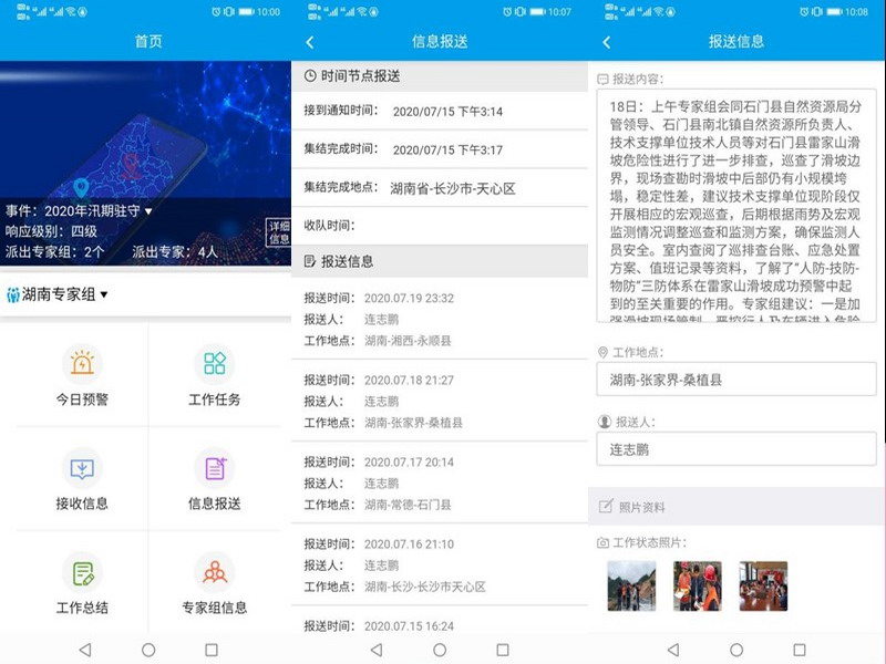 该系统综合利用国家级和省级地质灾害气象预警信息及地质灾害隐患分布,为部、局管理人员指挥调度分省派出专家组提供决策依据,支持管理人员在线下达工作任务和重要通知,实时掌握各专家组行程、当前位置和工作情况;基于智能手机,实现专家组现场指导工作日志和工作小结等信息在线填报。该系统实现对指挥调度工作全流程信息化管理,为开展成效分析、提升科学决策能力、优化工作流程、提升精细化管理水平提供重要技术支撑。